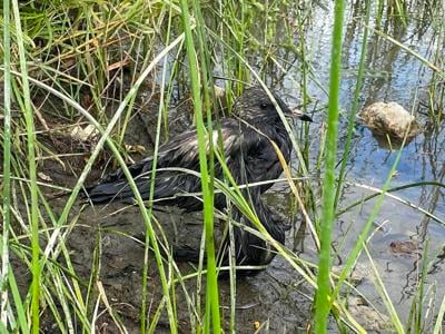 A gull covered in oil is seen on the bank of the St. Lawrence River, in east-end Montreal, where an oil spill occurred on Thursday July 25, 2024 in Montreal. THE CANADIAN PRESS/Stéphane Blais