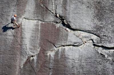 A climber is dwarfed by the massive rock face of the Chief in Stawamus Chief Provincial Park in Squamish, B.C., August 16, 2009. Police in Squamish, B.C., say two climbers sustained “significant injuries” and had to be rescued from a route on the Stawamus Chief mountain on Thursday. THE CANADIAN PRESS/Jonathan Hayward